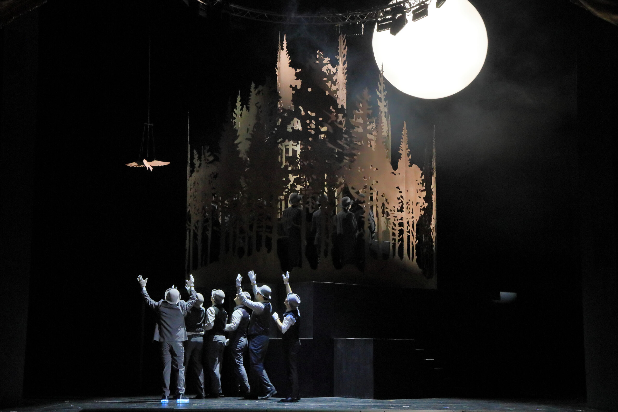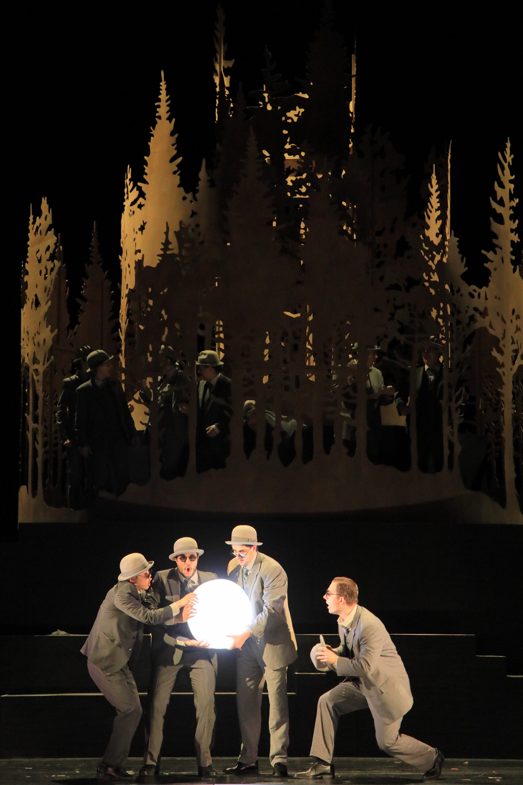 2. Der Vorhang hebt sich. Auf der Bühne derselbe Modellwald, den wir eben bei Lucrezia sahen. Der Mond hängt leuchtend in der Luft. Rote-grüne Illuminationen. Wir sehen vier junge Männer mit einer Melone auf dem Kopf. Die Kostümerie wie inspiriert von einer Varieté-Show aus dem Jahr von Orffs Uraufführung 1939.